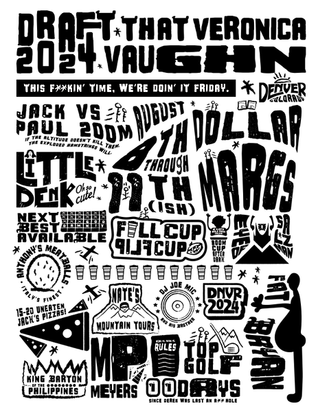 For the past decade, I’ve participated in a fantasy football league with 11 high school friends, hosting an annual in-person draft in Wisconsin or rotating travel destinations. To keep the league engaging, I design custom apparel, signage, and posters that highlight inside jokes, standings, or celebrate our shared traditions.